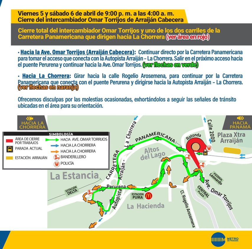 En horario de 9:00 p.m. a 4:00 a.m. se cerrará por completo el intercambiador Omar Torrijos Herrera en Arraiján. Los accesos alternativos han sido establecidos y se encuentran detallados en la infografía realizada por el Metro de Panamá.