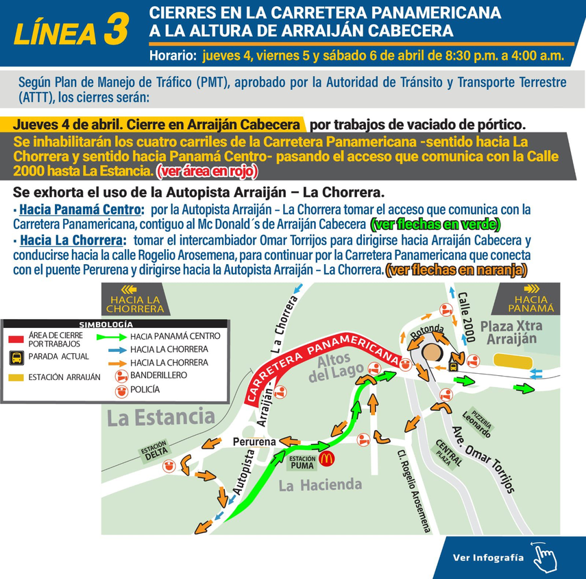 El Metro de Panamá anuncia que desde el jueves 4 al sábado 6 de abril se llevarán a cabo cierres en la carretera Panamericana, específicamente a la altura de Arraiján Cabecera, en diversos horarios debido al vaciado de pórtico.