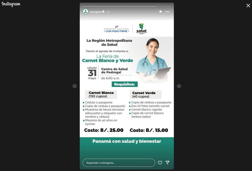 El Ministerio de Salud (MINSA) informa a la población que este sábado 31 de mayo se llevará a cabo una feria de carnet blanco y verde en el Centro de Salud de Pedregal, a partir de las 6:00 a.m.