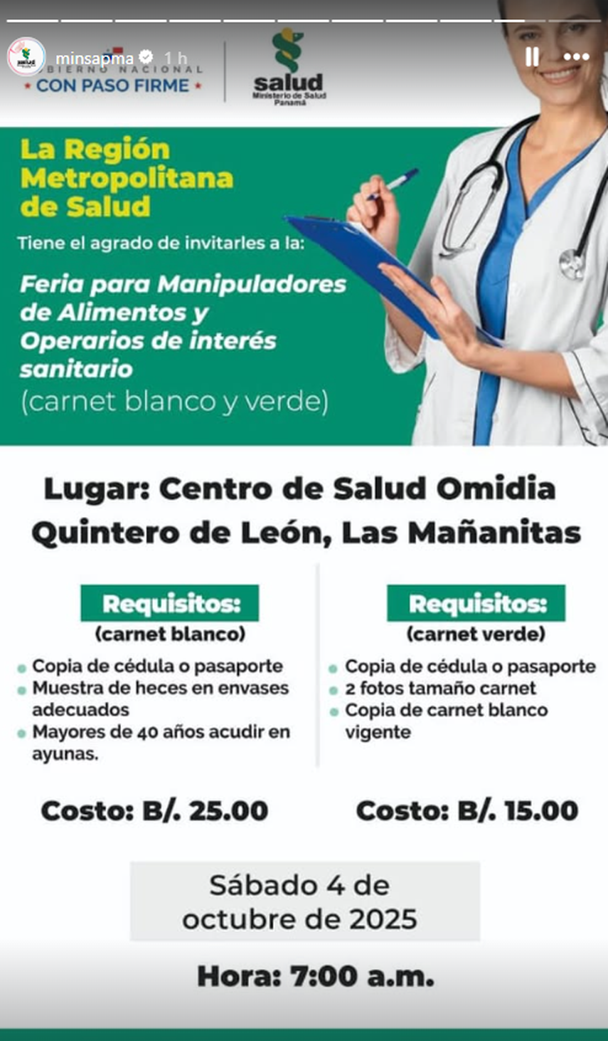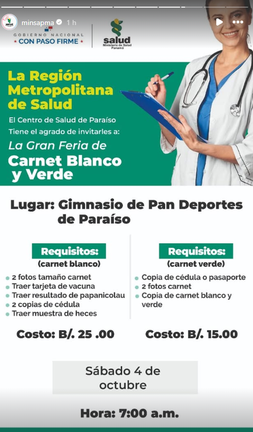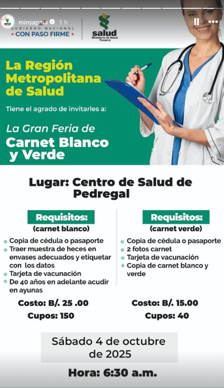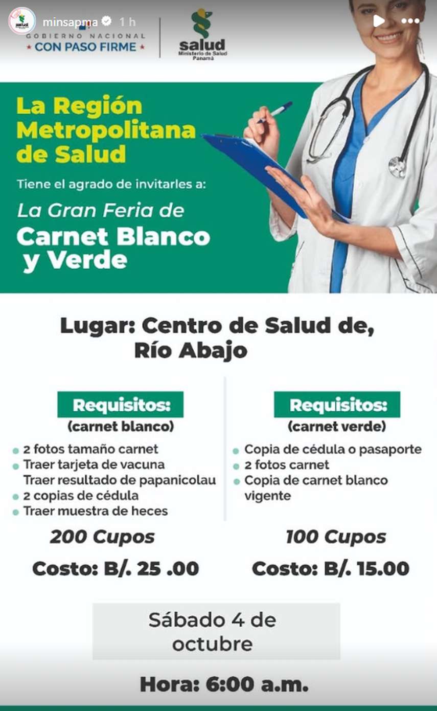 El Ministerio de Salud (MINSA) informó que este sábado 4 de octubre se llevarán a cabo cuatro ferias de carnet blanco y verde en la provincia de Panamá. La actividad se realizará por cupos y en horarios distintos en los espacios designados.