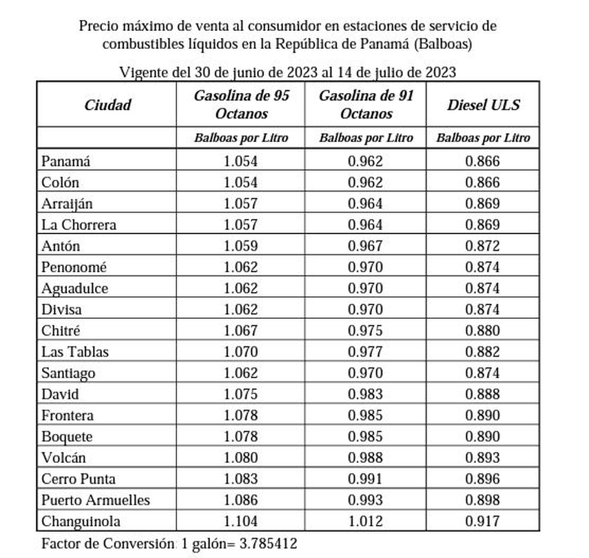 A partir de este viernes 30 de junio regirán nuevos precios en el combustible en Panamá, los cuales registran una alza en la gasolina de 95 octanos de B/.0.011 por litro. Mientras que la gasolina de 91 octanos bajará B/.0.008 por litro y el Diésel subirá B/.0.025 así lo dio a conocer la Secretaría Nacional de Energía de Panamá.