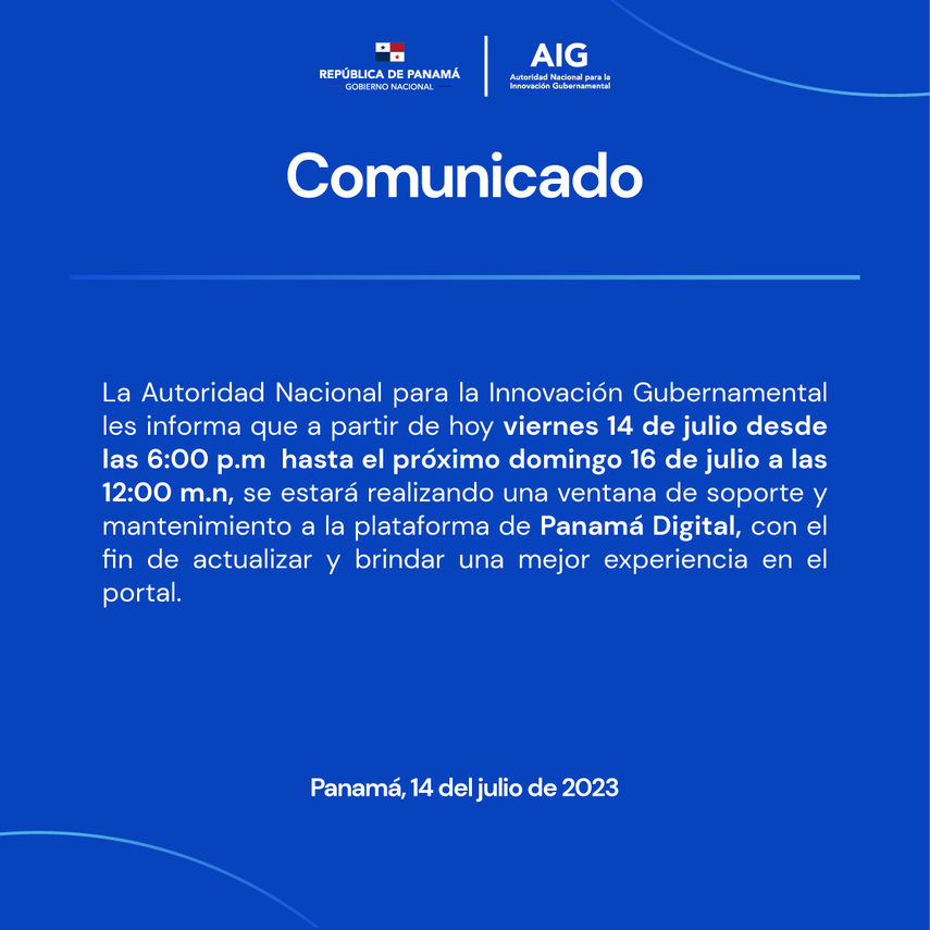 A partir de este viernes 14 de julio desde las 6:00 p.m. hasta el próximo domingo 16 de julio a las 12:00 media noche no estará disponible la plataforma de Panamá Digital, así lo anunció la Autoridad Nacional para la Innovación Gubernamental (AIG).