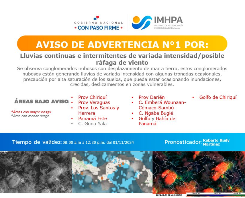 El Instituto de Meteorología e Hidrología de Panamá (IMHPA) ha informado que continuarán las lluvias intermitentes de variada intensidad, con posibles ráfagas de viento, hasta el mediodía de hoy en varias regiones del país.