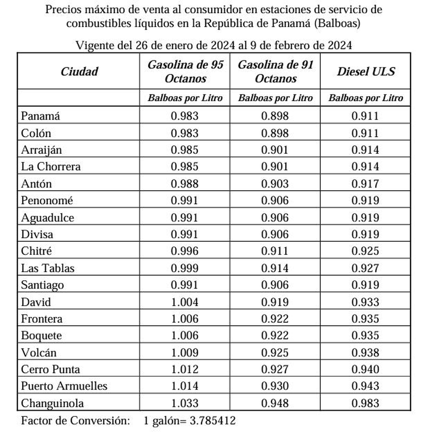 A partir de este viernes 26 de enero, los precios del combustible registrarán un aumento. Por litro, la gasolina de 95 octanos costará B/.0.983 (aumento de B/.0.032), la gasolina de 91 octanos B/.0.898 (aumento de B/.0.018) y el diésel B/.0.911 (aumento de B/.0.026).