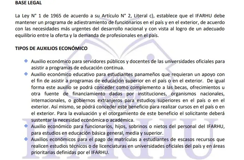 El alivio económico del Instituto para la Formación y Aprovechamiento de Recursos Humanos (IFARHU), conocido como auxilio económico, está dirigido a funcionarios públicos, docentes universitarios, estudiantes panameños y estudiantes de escasos recursos de universidades oficiales.
