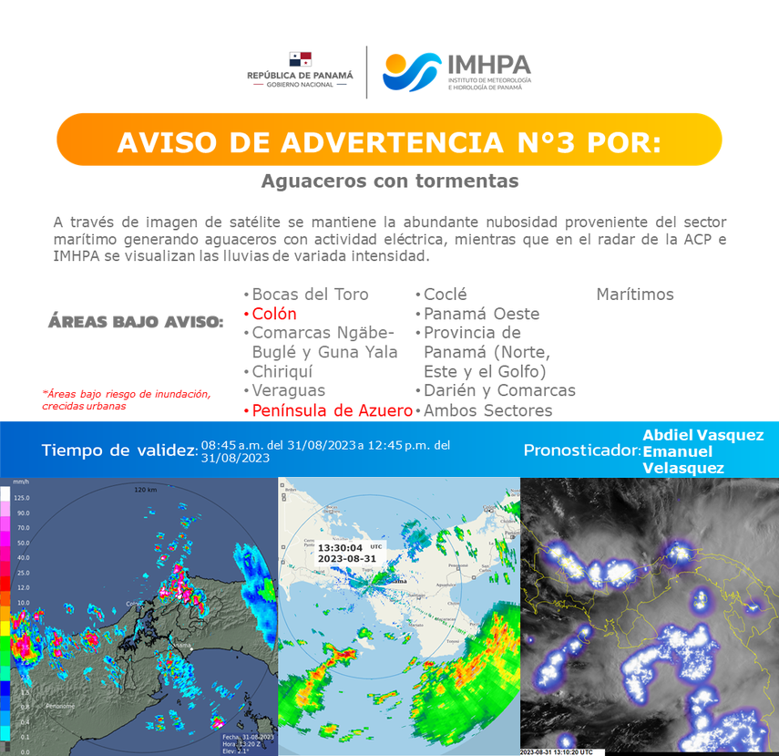 Según la entidad, en el radar de la Autoridad del Canal de Panamá (ACP) e IMHPA se visualiza las lluvias de variada intensidad. Las Áreas que mantienen aviso de prevención son: