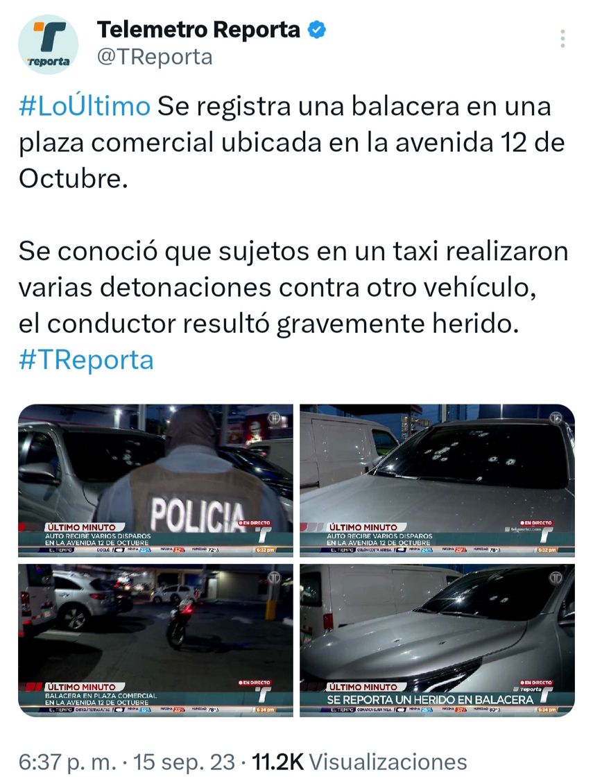 La Avenida 12 de Octubre, en la ciudad de Panamá, fue escenario de una balacera, luego de que personas dispararon a bordo de un taxi varias veces contra el auto de una persona que resultó herida en una plaza comercial.