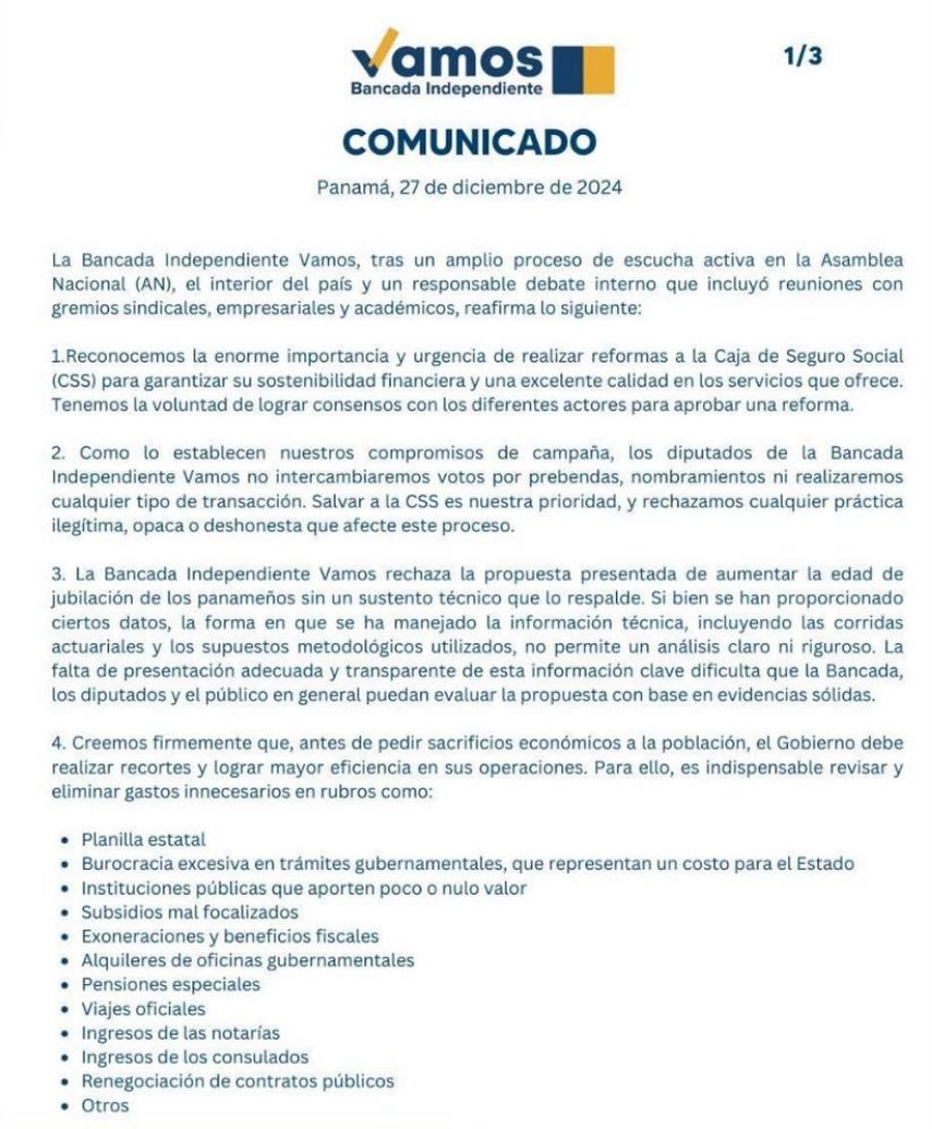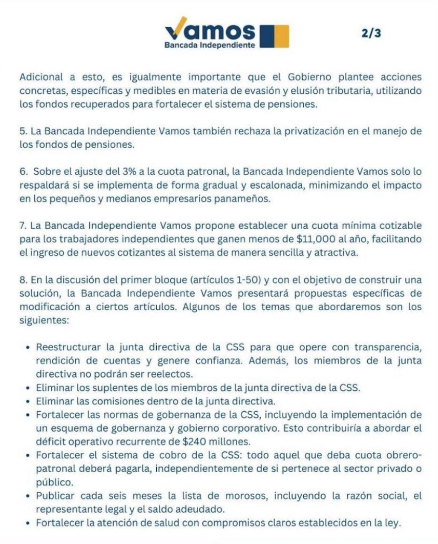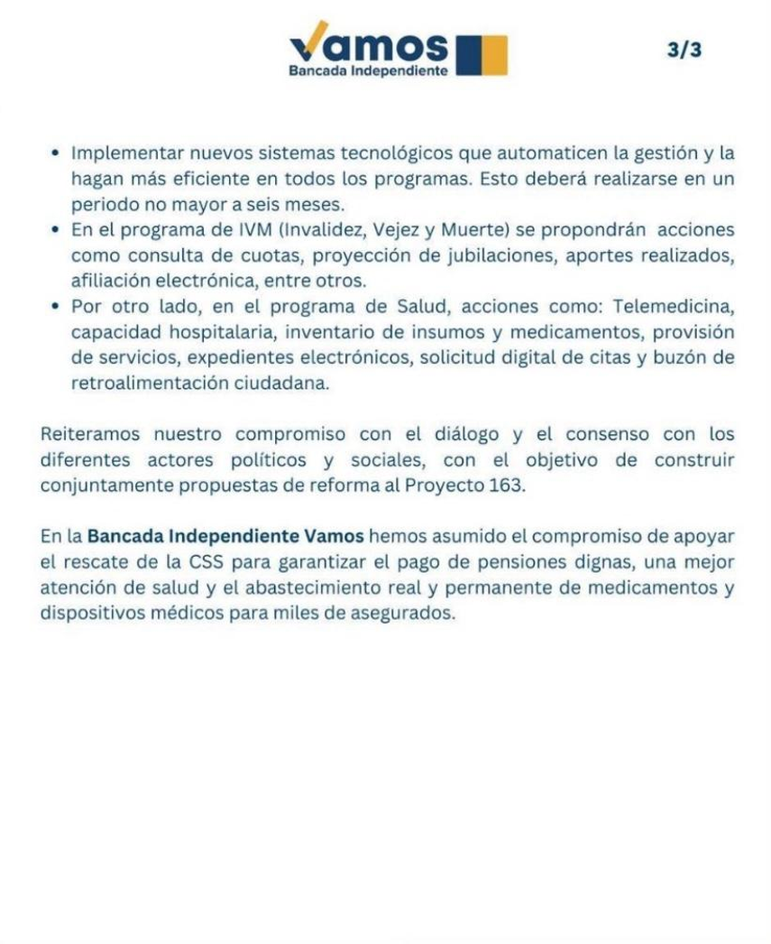 La Bancada Independiente Vamos, tras un proceso de consulta que incluyó debates internos y reuniones con gremios sindicales, empresariales y académicos, reafirmó su compromiso de trabajar en una reforma integral para garantizar la sostenibilidad de la Caja de Seguro Social (CSS) y procurar la calidad de sus servicios.