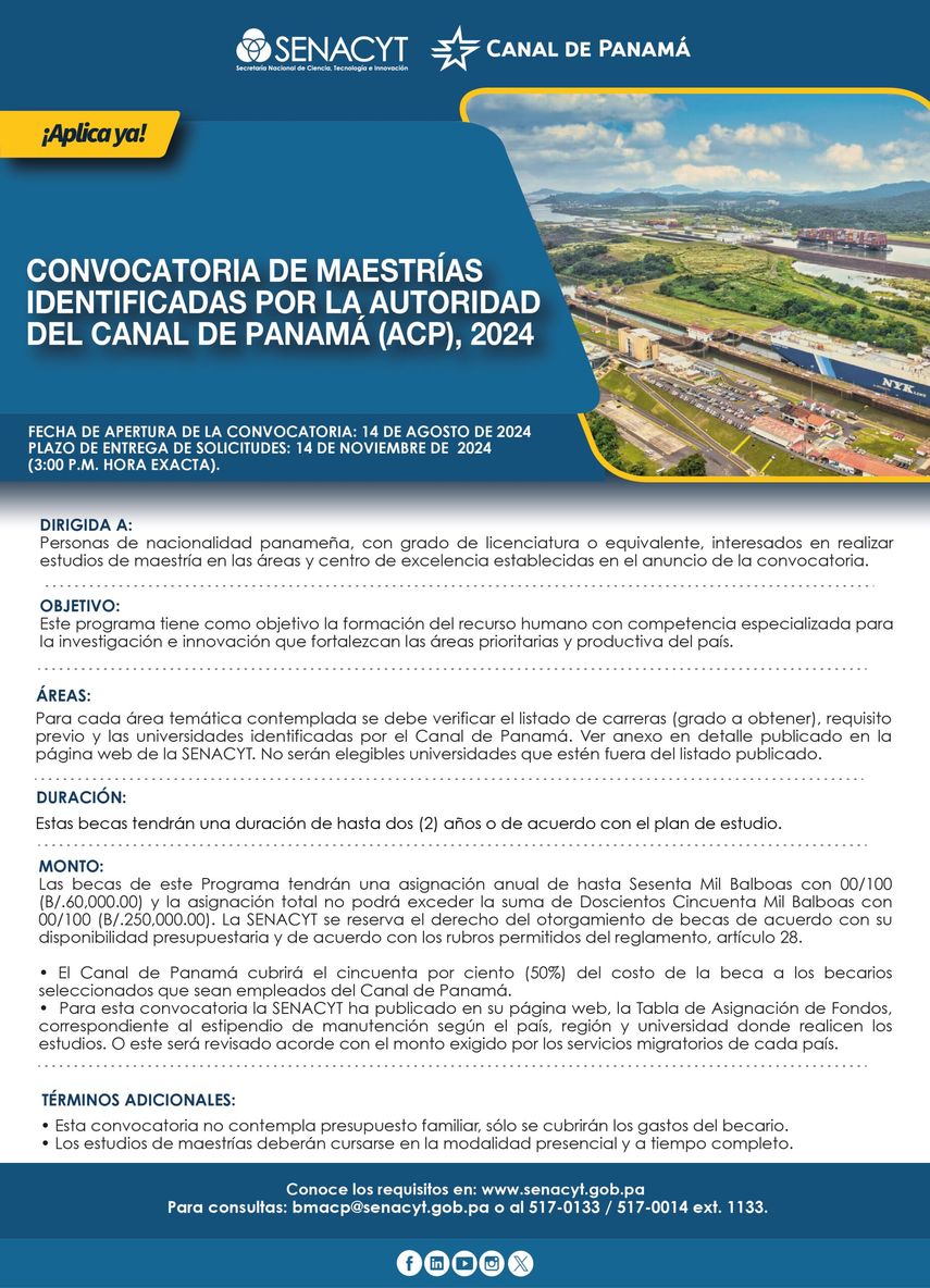 La fecha límite para la entrega de solicitudes es el 14 de noviembre de 2024. Más información visitando el sitio web: https://www.senacyt.gob.pa/convocatoria-de-maestrias-identificadas-por-la-autoridad-del-canal-de-panama-acp-2024/