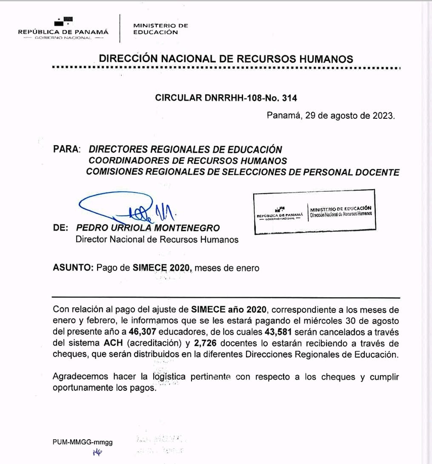 El Ministerio de Educación (MEDUCA) anunció que este miércoles, 30 de agosto, se hará efectivo el pago a 46,307 docentes, correspondiente a los meses de enero y febrero de 2020, relacionado al ajuste del Sistema Integral de Mejoramiento de la Calidad Educativa (Simece).