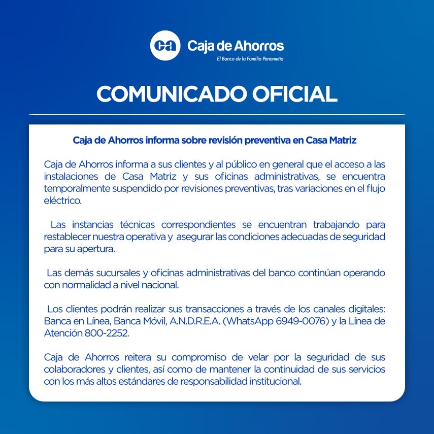 La Caja de Ahorros de Panamá informó que el acceso a su Casa Matriz y oficinas administrativas se encuentra temporalmente suspendido, debido a revisiones preventivas tras registrarse variaciones en el flujo eléctrico.