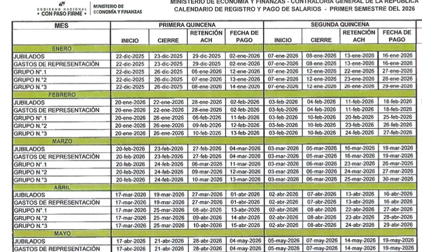 El Ministerio de Economía y Finanzas (MEF) y la Contraloría General de la República dieron a conocer el calendario oficial de pago de salarios para los servidores públicos, correspondiente al primer semestre de 2026, con el objetivo de facilitar la planificación financiera de los funcionarios del Estado.