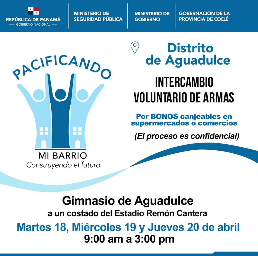 El Programa "Pacificando Mi Barrio, Construyendo el Futuro" tendrá lugar en el distrito de Aguadulce los días martes 18, miércoles 19 y jueves 20 de abril en horario de 9:00 a.m. a 3:00 p.m., en el Estadio Remón Cantera.