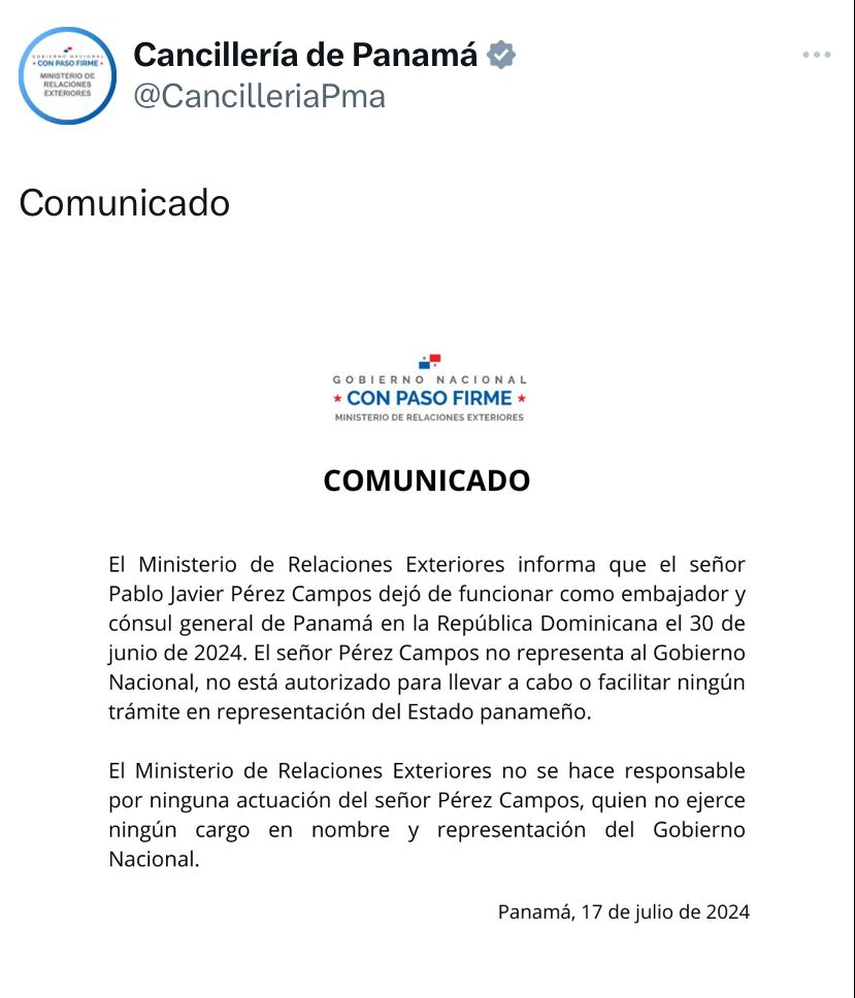 El Ministerio de Relaciones Exteriores de Panamá ha comunicado oficialmente que el señor Pablo Javier Pérez Campos dejó de ejercer sus funciones como Embajador y Cónsul General de Panamá en la República Dominicana a partir del 30 de julio de 2024. El señor Pérez Campos ya no representa al Gobierno Nacional y no está autorizado para realizar o facilitar ningún trámite en nombre del Estado panameño.
