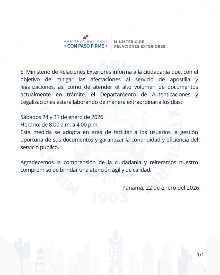 La Cancillería de Panamá informó a la ciudadanía que, con el objetivo de mitigar las afectaciones en el servicio de apostilla y legalizaciones y atender el alto volumen de documentos actualmente en trámite, el Departamento de Autenticaciones y Legalizaciones laborará de manera extraordinaria en fechas específicas durante el mes de enero de 2026.