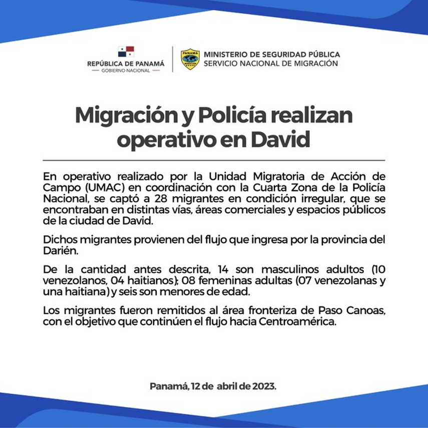 La Unidad Migratoria de Acción de Campo (Umac) en colaboración con la Cuarta Zona de la Policía Nacional (PN) dieron con la captura de 28 migrantes irregulares en un operativo realizado en el distrito de David, provincia de Chiriquí.