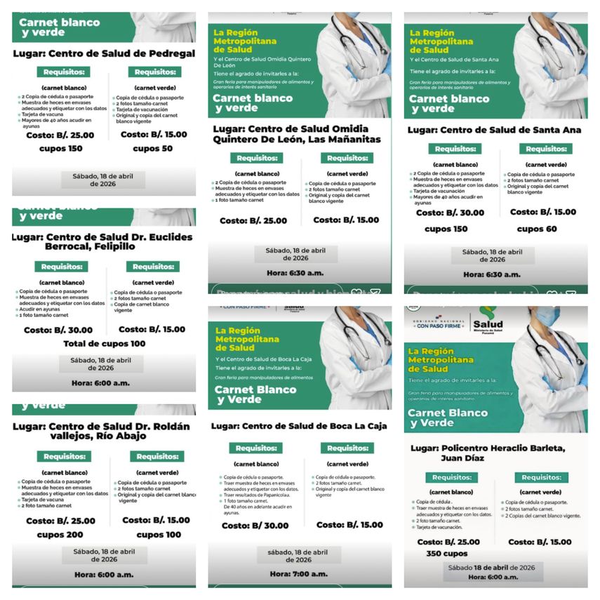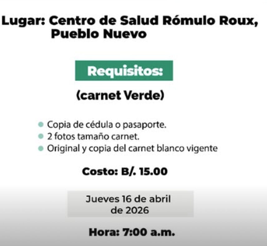El Ministerio de Salud (MINSA), a través de la Región Metropolitana de Salud, anunció la realización de ferias para la obtención y renovación del carnet blanco y carnet verde desde el jueves 16 al sábado 18 de abril de 2026.