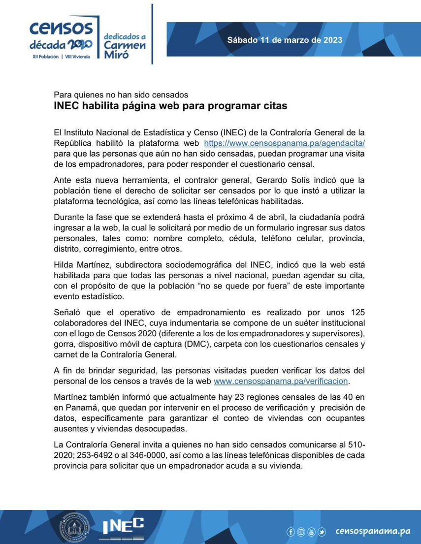 Para todos los ciudadanos que no han llenado el cuestionario de los Censos 2020 en todo el país, el Instituto Nacional de Estadística y Censo (INEC), habilitó el portal web www.censospanama.pa, con el propósito de reprogramar una visita por parte de los empadronadores.