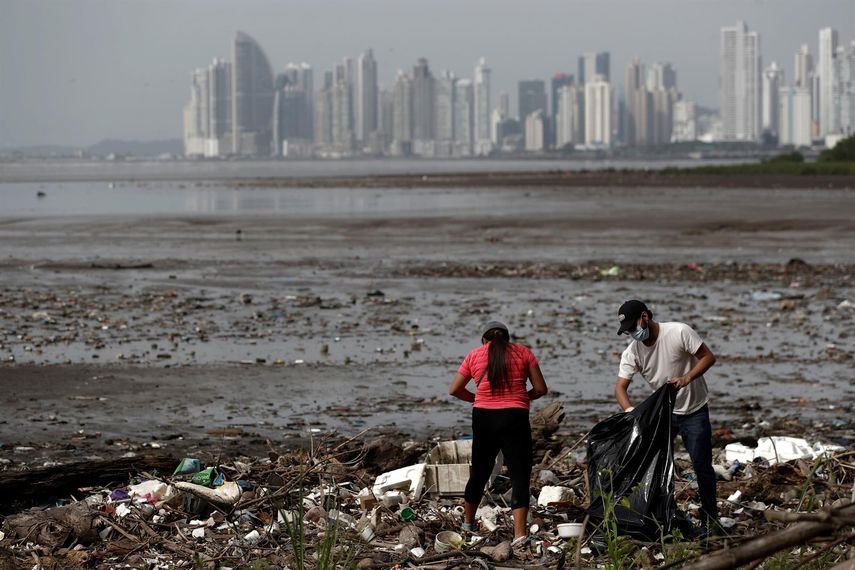 Tres voluntarios cargaban este sábado, caminando lentamente por encima del lodo, los restos de un sofá que el océano arrastró hasta una de las principales costas de la Ciudad de Panamá, donde la basura se acumula por toneladas.