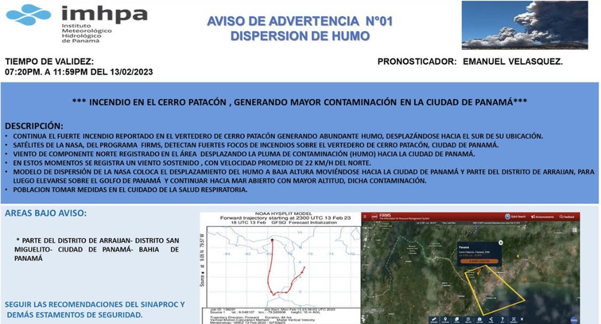 Tras el incendio en Cerro Patacón según el IMHPA, se está generando mayor contaminación en la ciudad de Panamá. Estando bajo aviso las partes de Arraiján-distrito de San Miguelito-ciudad de Panamá-Bahía de Panamá.