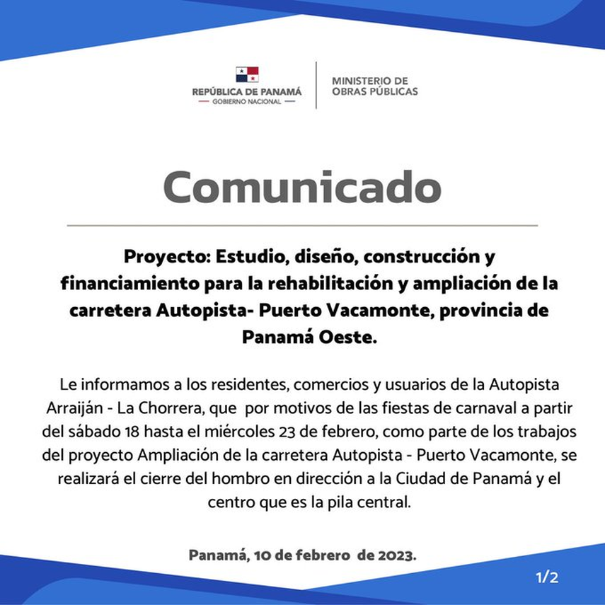 El próximo lunes 13 de febrero, se realizará un cierre de carril como parte de los trabajos del proyecto de ampliación Autopista-Puerto Vacamonte, en horario de 8:00 p.m. a 3:00 a.m. y adicional se realizará el cierre temporal que será del hombro en la entrada hacia El Puerto Vacamonte por dos meses a partir del 13 de febrero.