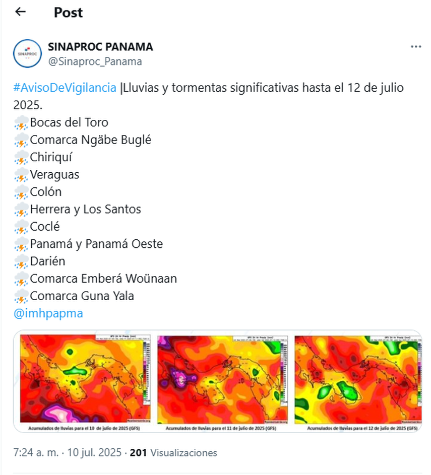 El Instituto de Meteorología e Hidrología de Panamá (IMHPA) a través de sus meteorólogos Julissa Rivera y Emanuel Velázquez explican el aviso de vigilancia por lluvias y tormentas significativas, vigente hasta las 11:59 p.m. del sábado 12 de julio de 2025.