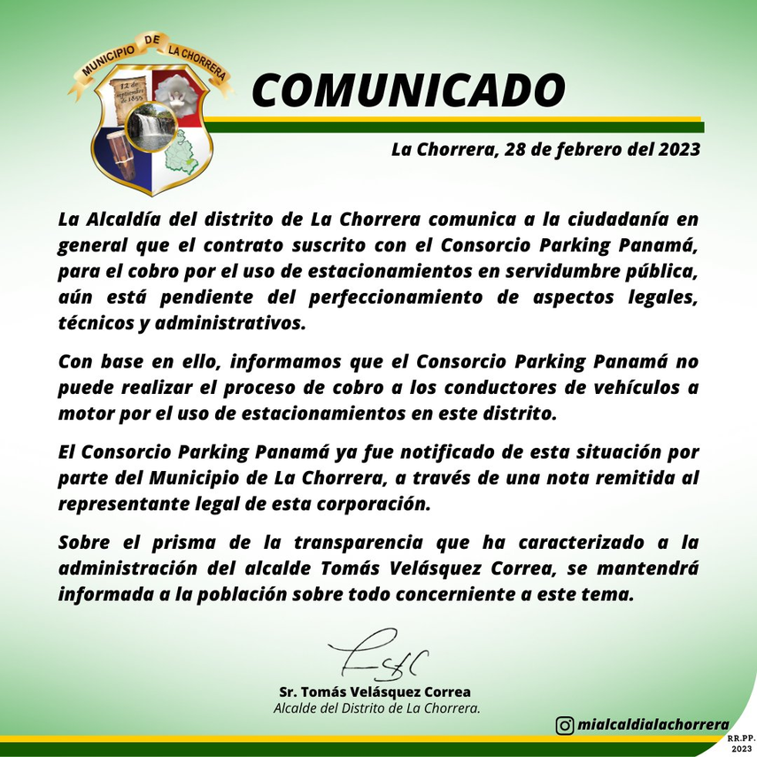 La comuna del distrito chorrerano, hace de conocimiento a la ciudadanía en general que el Consorcio Parking Panamá, el cual sería el encargado del cobro por el uso de estacionamiento en servidumbre pública, aún está pendiente del "perfeccionamiento de aspectos legales, técnicos y administrativos".