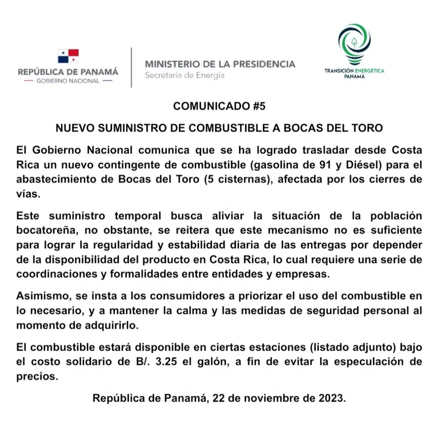 La Secretaría de Energía informa que ha conseguido trasladar un nuevo contingente de combustible (gasolina de 91 y diésel) desde Costa Rica para abastecer a Bocas del Toro, afectada por los cierres de vías. Se han destinado 5 cisternas para esta operación.