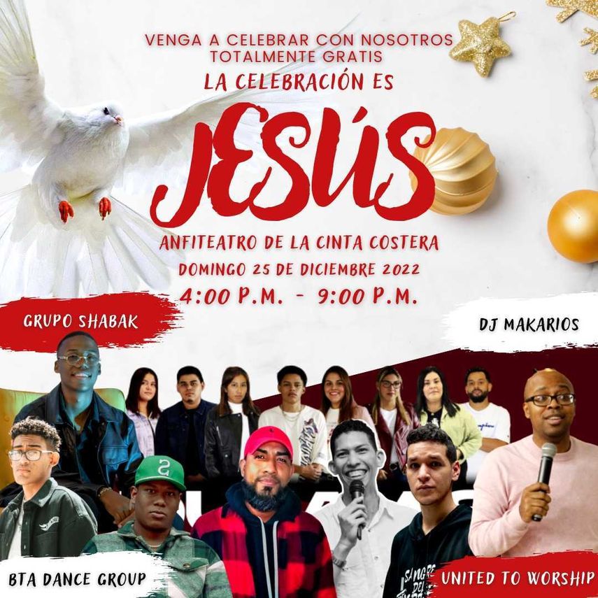 Adicional, en el Anfiteatro de la Cinta Costera, habrá la actividad La Celebración es Jesús, desde las 4:00 p.m. a 9:00 p.m. Se presetará el grupo Shabak, BTA Dance Group, United to Worship, Dj Makarios y muchos más.