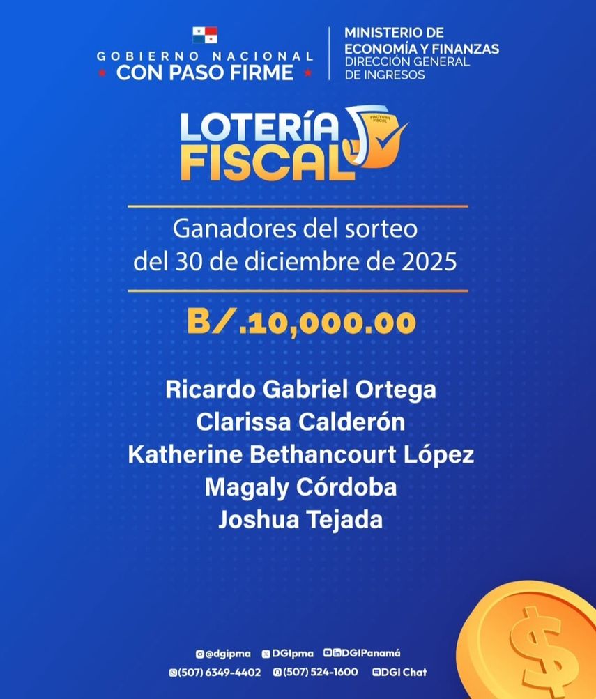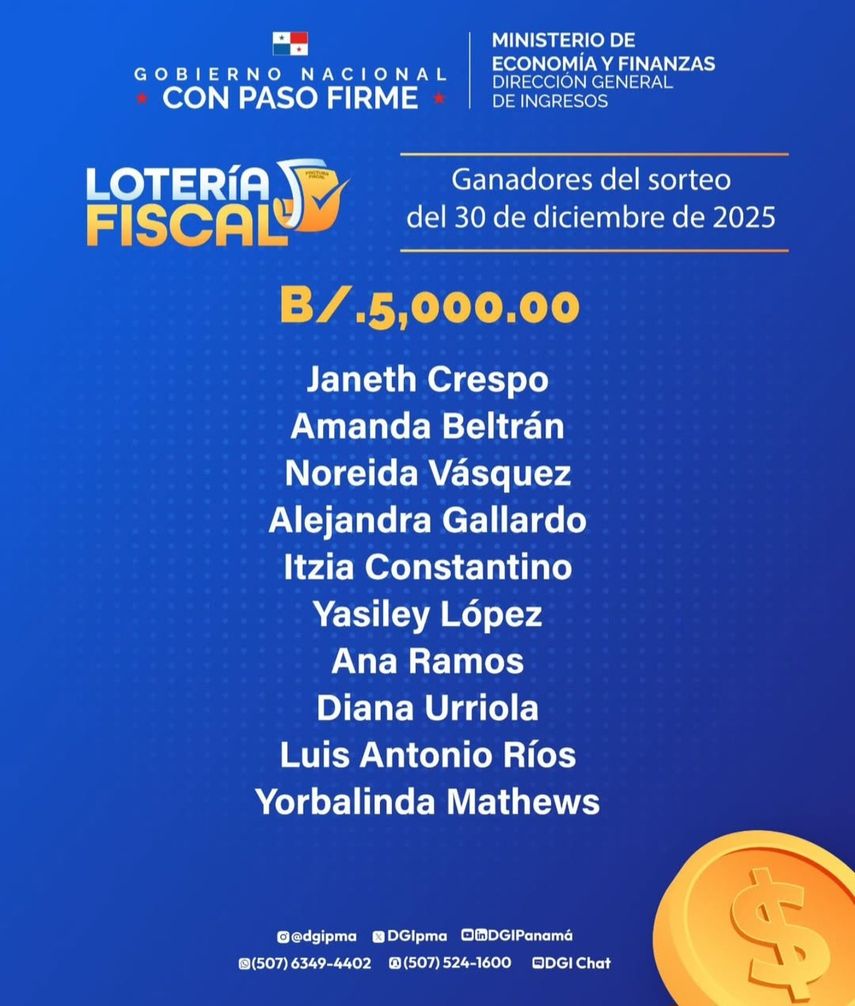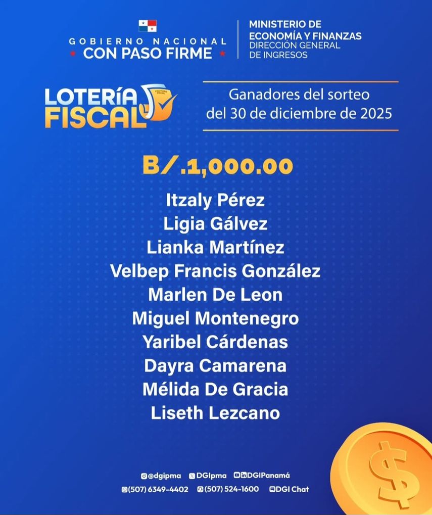 Este martes 30 de diciembre se realizó el último sorteo de la Lotería Fiscal de 2025, beneficiando a 25 ganadores con premios de B/.10,000.00, B/.5,000.00 y B/.1,000.00, durante una transmisión en vivo a través de YouTube desde Los Andes Mall, en el distrito de San Miguelito.