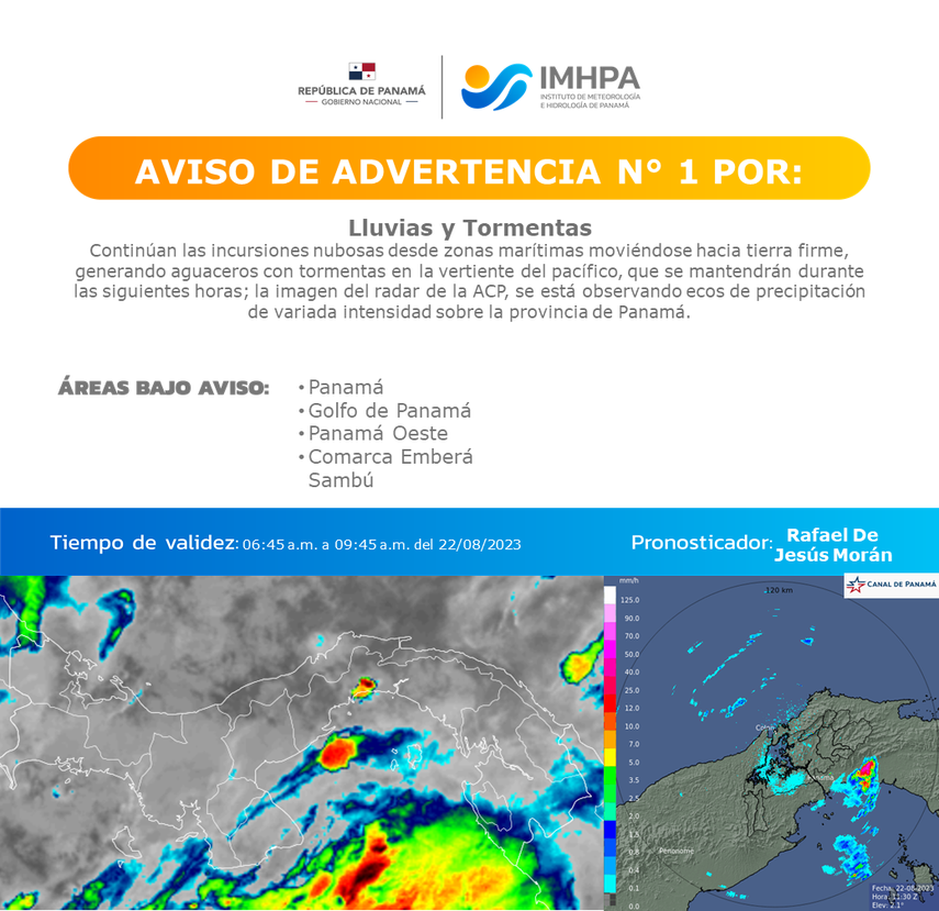 El Instituto de Meteorología e Hidrología de Panamá (IMHPA) compartió un aviso de advertencia por lluvias y tormentas que continúan en el país; el pronosticador Rafael De Jesús Morán, explica que las incursiones nubosas continúan desde zonas marítimas moviéndose hacia tierra firme.