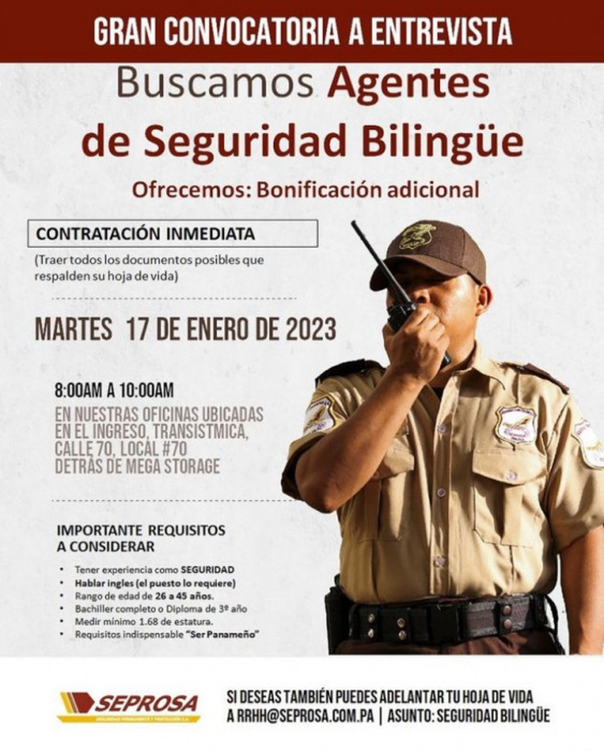 Para contratación inmediata, la empresa de seguridad privada SEPROSA, realizará una feria de empleo para este martes 17 de enero del 2023 en la ciudad de Panamá, con miras a reclutar personal que labore como seguridad y que cuente con conocimiento en el habla del inglés. Estarán ofreciendo a los seleccionados bonificación adicional.