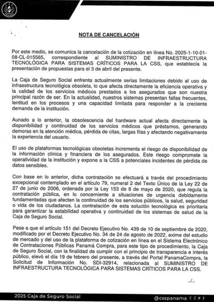 La Caja de Seguro Social (CSS) anunció la cancelación de la cotización en línea No. 2025-1-10-01-08-CL-015565, correspondiente al suministro de infraestructura tecnológica para sistemas críticos de la institución.