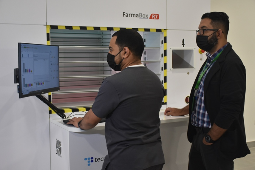 Ramos destacó que la tecnología robótica de FarmaBox gestiona un inventario organizado de medicamentos en el almacén. Cuando se recibe una receta, el sistema computarizado carga y organiza los medicamentos necesarios, y luego los dispensa de manera precisa.
