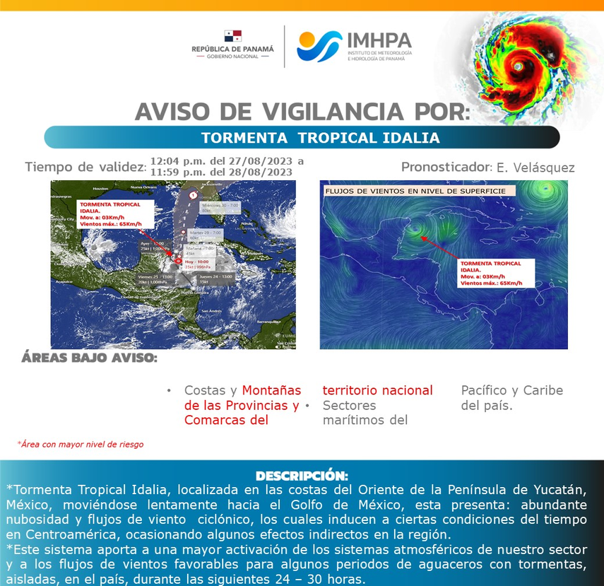 El Instituto de Meteorología e Hidrología de Panamá (IMHPA) emitió un aviso de vigilancia hasta el 28 de agosto por la tormenta tropical Idalia, que aporta mayor activación de sistemas atmosféricos y a flujos de vientos favorables para aguaceros con tormentas aisladas.