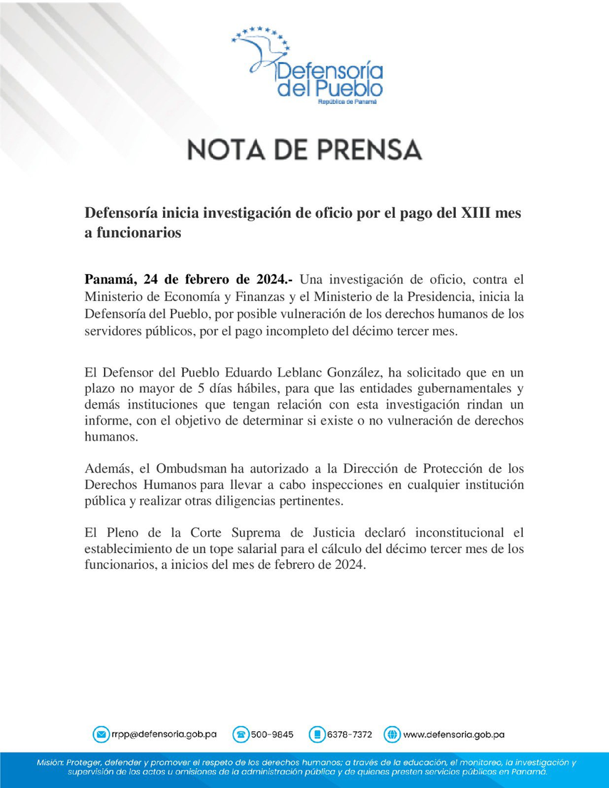 La Defensoría del Pueblo abrió una investigación de oficio, contra el Ministerio de Economía y Finanzas y el Ministerio de la Presidencia, inició la Defensoría del Pueblo, por posible vulneración de los derechos humanos de los servidores públicos, por el pago incompleto del Décimo Tercer Mes.