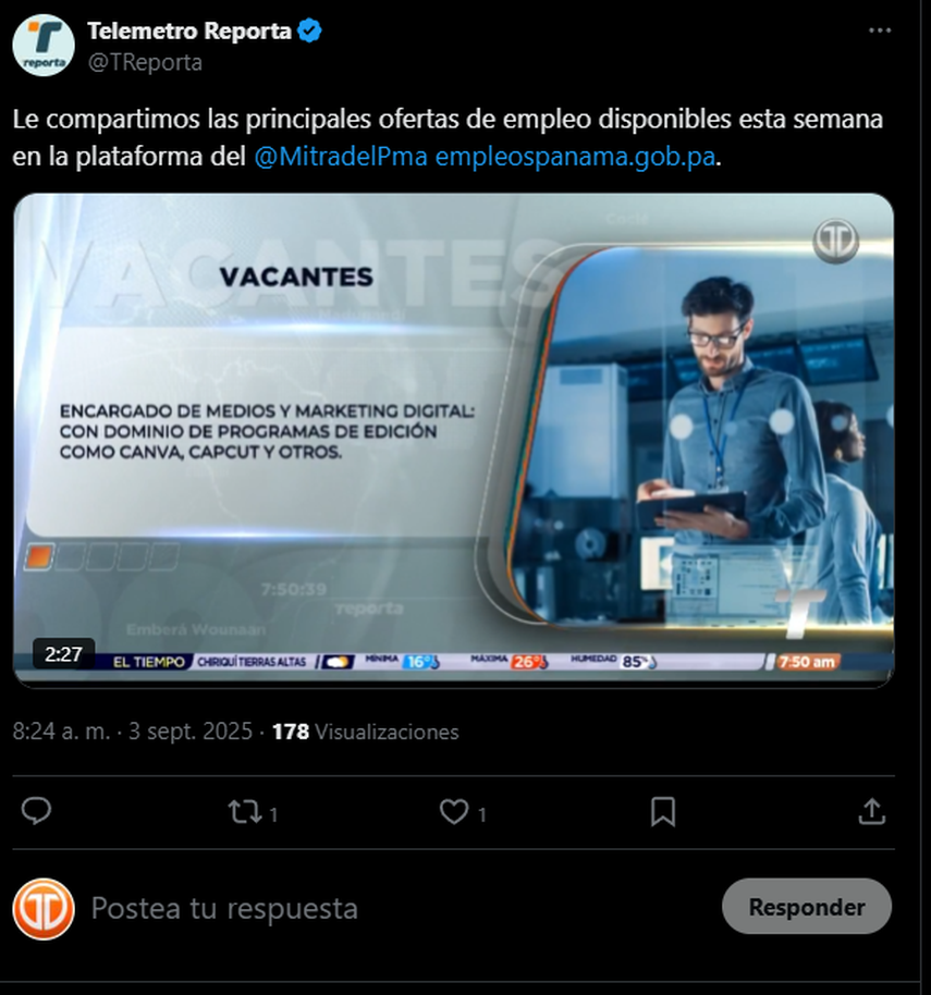 El Ministerio de Trabajo y Desarrollo Laboral (MITRADEL), indicó que el portal empleospanama.gob.pa mantiene ofertas disponibles en la provincia de Panamá y otras regiones del país. Entre las vacantes destacan:
