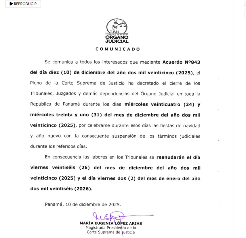 El Órgano Judicial informó que, mediante el Acuerdo N.° 843 del 10 de diciembre de 2025, el Pleno de la Corte Suprema de Justicia decretó el cierre de los Tribunales, Juzgados y demás dependencias judiciales en toda la República de Panamá durante los días miércoles 24 y miércoles 31 de diciembre de 2025, con motivo de las festividades de Navidad y Año Nuevo.