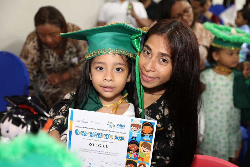 Como parte de este cierre anual, el MIDES realizó un acto de reconocimiento a 45 niños y niñas de los CAIPI de Panamá Centro —Porvenir, Arroyito Mío, Lorena de Domínguez Marín y CAIPI MIDES Sede— quienes culminaron el nivel maternal C y se preparan para iniciar prekínder en el sistema educativo del Ministerio de Educación (MEDUCA).