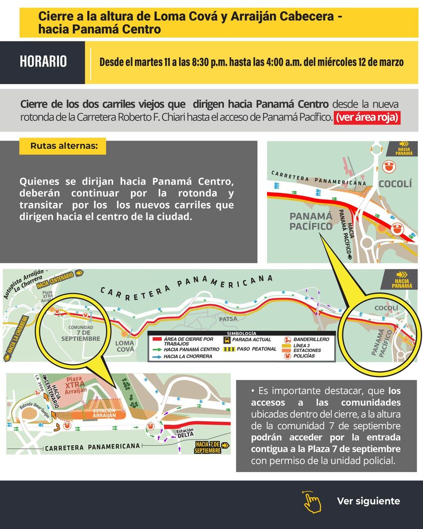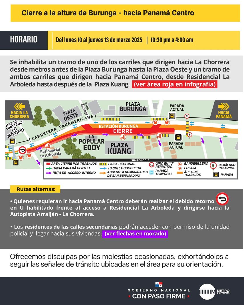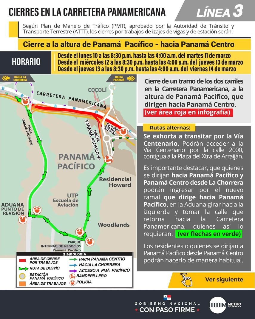 El Metro de Panamá informó sobre los cierres que se llevarán a cabo en la carretera Panamericana debido a los trabajos de izaje de vigas en la Línea 3 . Estos trabajos se realizarán desde este lunes 10 hasta viernes 14 de marzo, afectando los siguientes puntos: Panamá Pacífico en dirección a Panamá Centro, Loma Cová y Arraiján cabecera, Burunga hacia Panamá Centro.