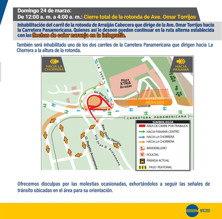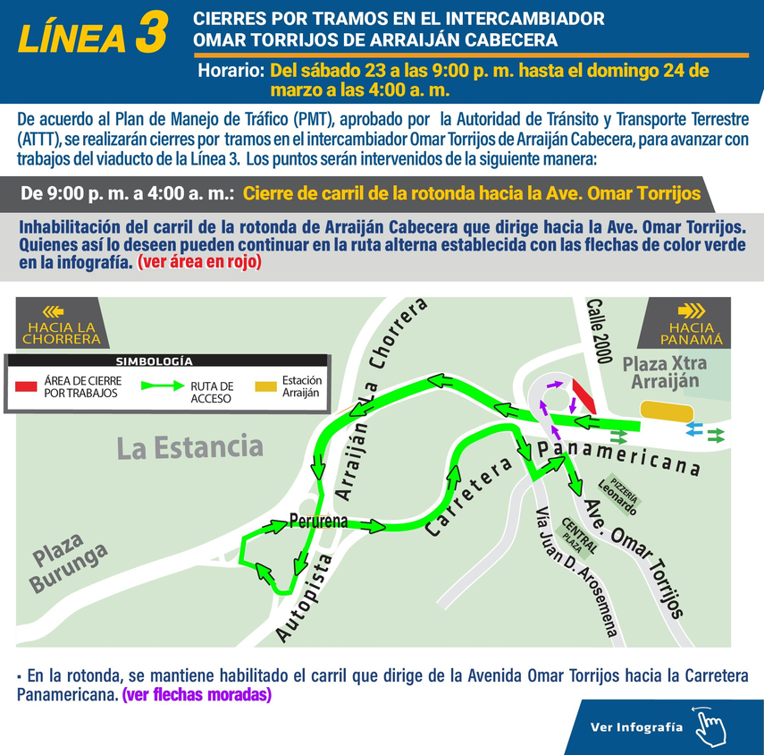 Desde las 9:00 p.m. hasta las 4:00 a.m. del sábado 23 de marzo, se inhabilitará el carril de la rotonda de Arraiján que dirige hacia la avenida Omar Torrijos. Los conductores podrán continuar en la ruta alterna establecida en la siguiente infografía.