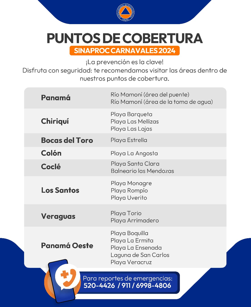 El Sistema Nacional de Protección Civil (SINAPROC) comparte con la ciudadanía los puntos de cobertura durante las fiestas del Carnaval 2024.