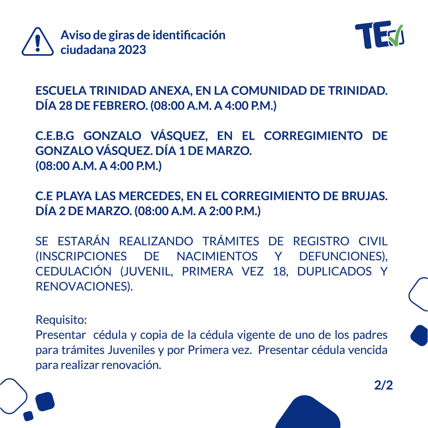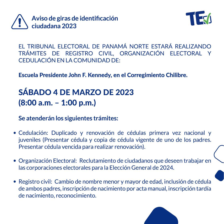 El Tribunal Electoral anuncia giras de identificación ciudadana en la Escuela Presidente John F. Kennedy, en el corregimiento de Chilibre, Panamá Norte, el sábado 4 de marzo de 8:00 a.m. a 1:00 p.m.