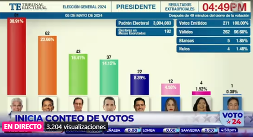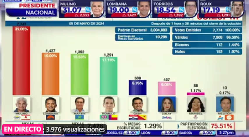 Después de dos horas y media de conteo por parte de la Junta Nacional de Escrutinio, el candidato por los partido Realizando Metas y Alianza, José Raúl Mulino, se encuentra liderando los votos emitidos en las elecciones generales realizadas este domingo en Panamá.