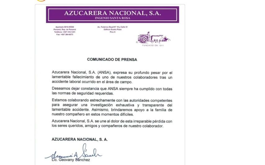 La azucarera expresa su pesar hacia los familiares y destaca su colaboración con las autoridades para asegurar una investigación exhaustiva y transparente del lamentable accidente. Asimismo se compromete a brindar el apoyo a los familiares del fallecido.