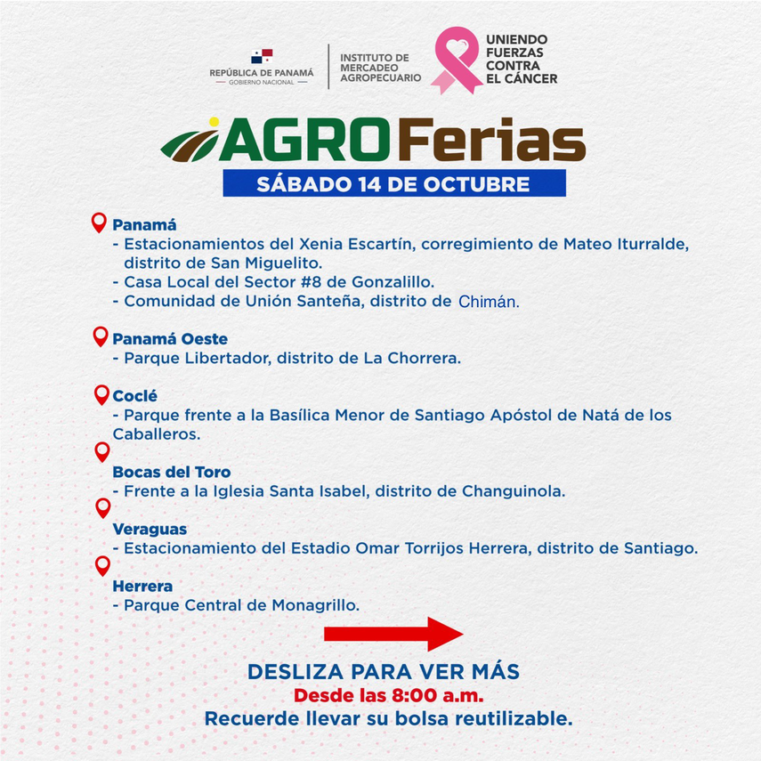 Estas serán las Agroferias programadas por el Instituto de Mercadeo Agropecuario (IMA) para el sábado 14 y domingo 15 de octubre en las provincias de Panamá, Bocas del Toro, Veraguas, entre otras, que estarán abiertas al público desde las 8:00 a.m.