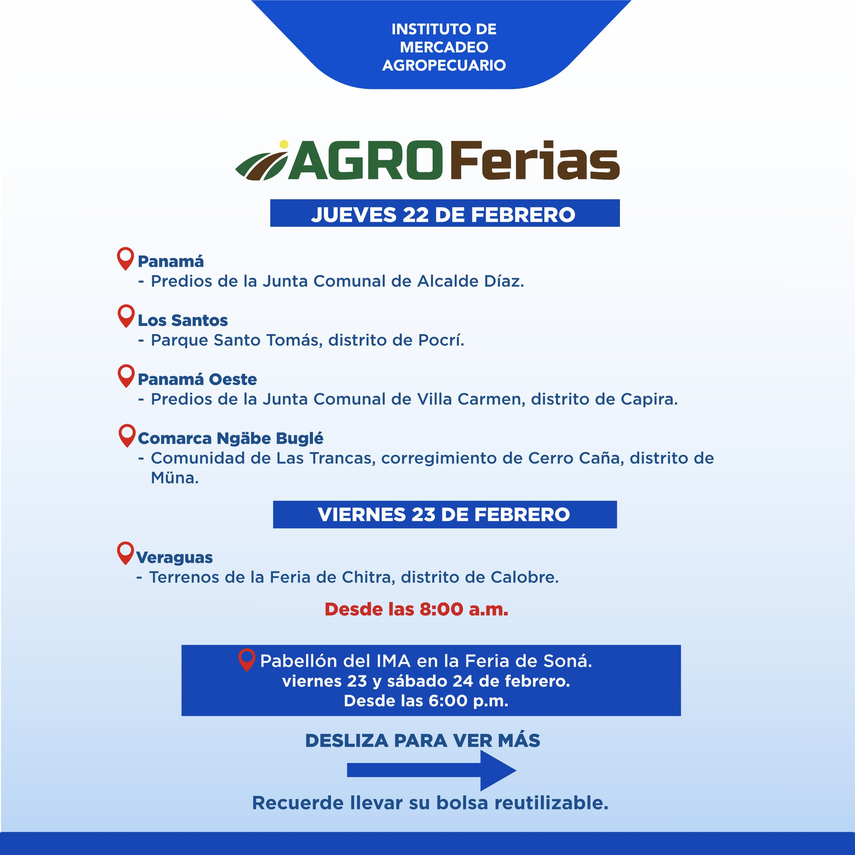 Este viernes 23 de febrero habrán Agroferias del Instituto de Mercadeo Agropecuario (IMA), con productos a bajo costo y de calidad para los panameños, desde las 6:00 p.m. Se recomienda a los ciudadanos asistir con sus bolsas reutilizables.