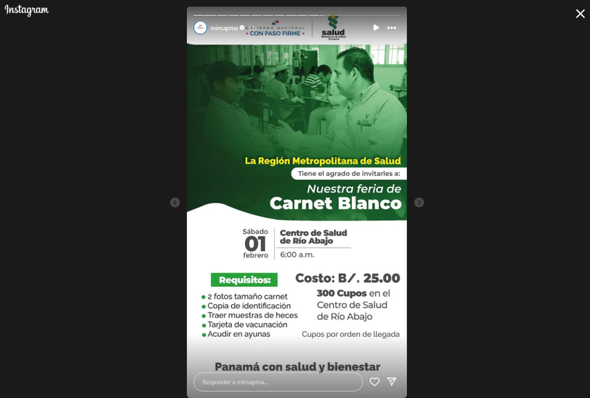El Ministerio de Salud (MINSA) llevará a cabo una feria especial para la emisión del Carnet Blanco, dirigida a manipuladores de alimentos interesados en realizar este trámite. La actividad se desarrollará el próximo sábado, 1 de febrero, a partir de las 6:00 a.m., en el Centro de Salud de Río Abajo.