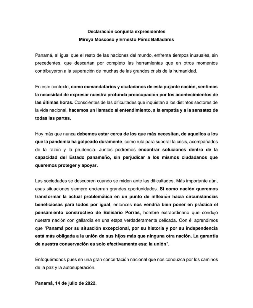 Los expresidentes de la República de Panamá Ernesto Pérez Balladares (1994-1999) y Mireya Moscoso (1999-2004) emitieron este jueves un pronunciamiento conjunto ante la situación que enfrenta el país, sumido en protestas sociales y cierres de vías, por el alto costo de la vida.
