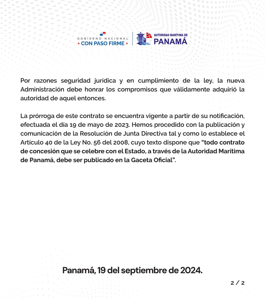 En la Gaceta Oficial fue publicada la resolución J.D.N°008-2023, en la que se aprobó la prórroga del contrato N°70 del 22 de enero de 1998 entre la sociedad de Panama Canal Railway Company y la Autoridad Marítima de Panamá (AMP).